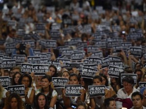 Members of Sydney’s French community gather in the heart of the city to hold aloft banners reading « Je Suis Charlie » (I am Charlie) on January 8, 2015, in tribute to the victims killed after gunmen opened fire in the offices of French satirical weekly Charlie Hebdo in Paris the day before. The vigil, just metres from where two hostages and a gunman died after a cafe siege in Sydney’s Martin Place less than a month ago, saw many French and Australians carrying white and black « Je Suis Charlie » placards. AFP PHOTO/Peter PARKS
