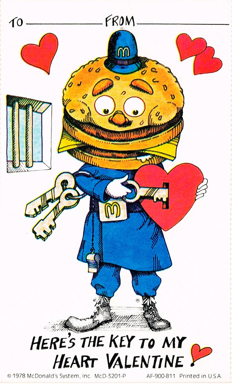 Très improbable mais vrai, la célèbre chaîne de fast-food McDonald’s a édité des cartes de Saint-Valentin en 1978, avec des illustrations mettant en scène les personnages de son McDonaldl