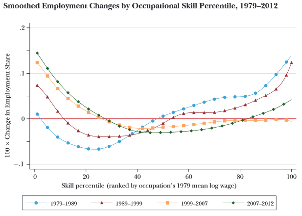 Sur ce graphique, provenant des travaux d’Autor, les lignes correspondent aux quatre dernières décennies. Les points placés en dessous de la ligne horizontale rouge indiquent qu’il y a eu une diminution du nombre d’emplois. Dès qu’une des courbes passe au dessus de cette ligne rouge, il y a eu une création d’emploi. Plus les points sont placés à gauche, plus ce sont des emplois non qualifiés. A l’inverse, plus ils sont à droite, plus ils représentent les emplois qualifiés.