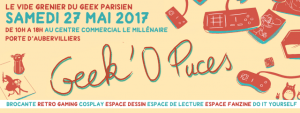 Geek’O’Puces, une brocante dédiée à la culture POP et au Cinéma. Le rendez vous des otakus, des geeks, des amoureux des mondes imaginaires. On y retrouve des particuliers qui proposent : BD, Manga, Comics, DVD, Série, Cinéma, consoles et jeux vidéo, Jeux de Rôle, Jeux de Cartes à Collectionner, Jeu de Société, jouets, figurines, romans, DVD, Cosplay…